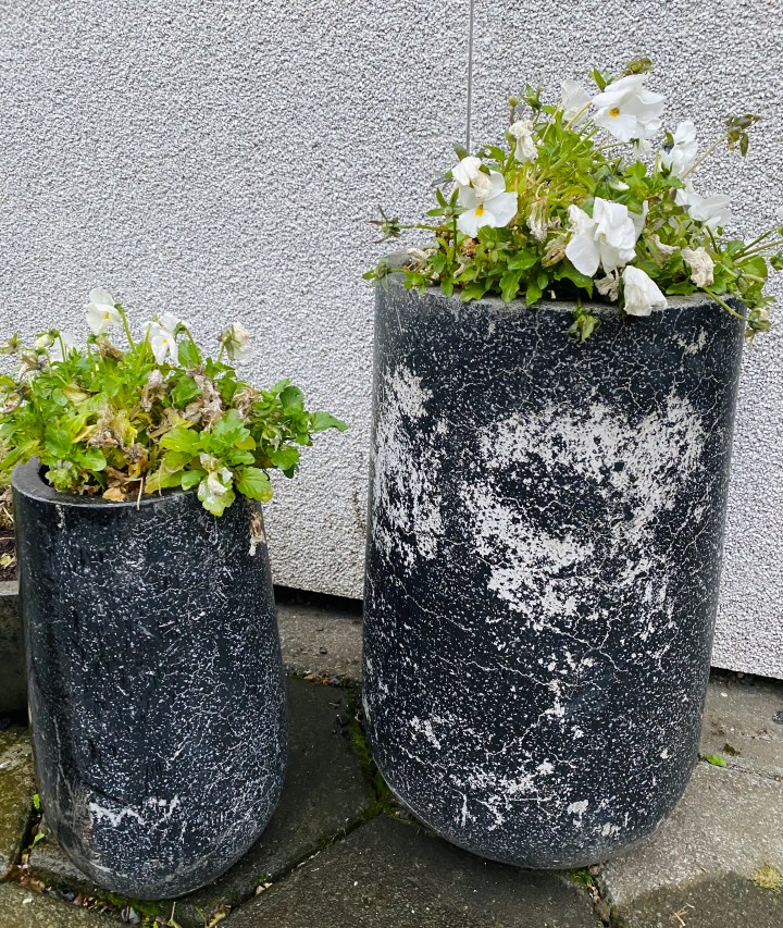 Næst fór ég eina umferð yfir pottana með gráum lit – Hjörva 30 – utanhús akrýlmálningu og leyfði þeim að þorna aftur í 4 klukkutíma.