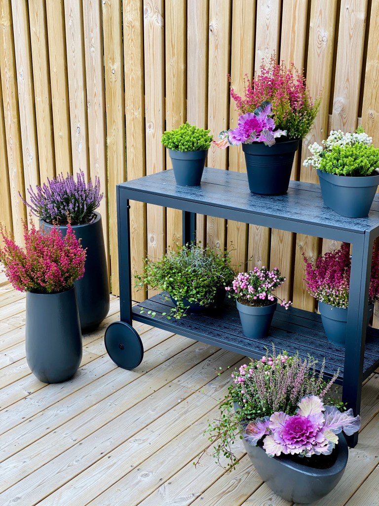 Pottarnir njóta sín vel úti á palli núna með haustplöntunum mínum.